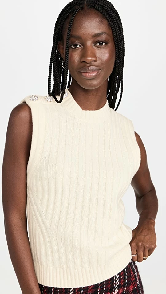 Bright crystalline decorative buttons accent the shoulder of this GANNI sweater vest, which is crafted from a ribbed blend of soft wool.
