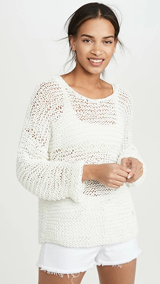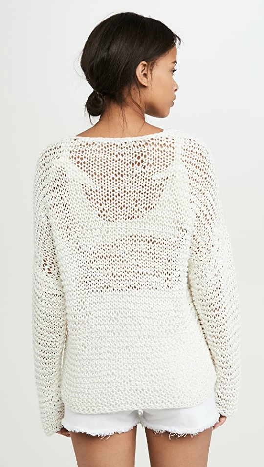 Crafted from bright-white, loose-knit yarn, MIKOH’s Mehetia top is an essential layering piece that goes from beach to street with easeβjust swap out your bikini bottoms for cutoffs.