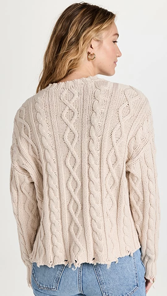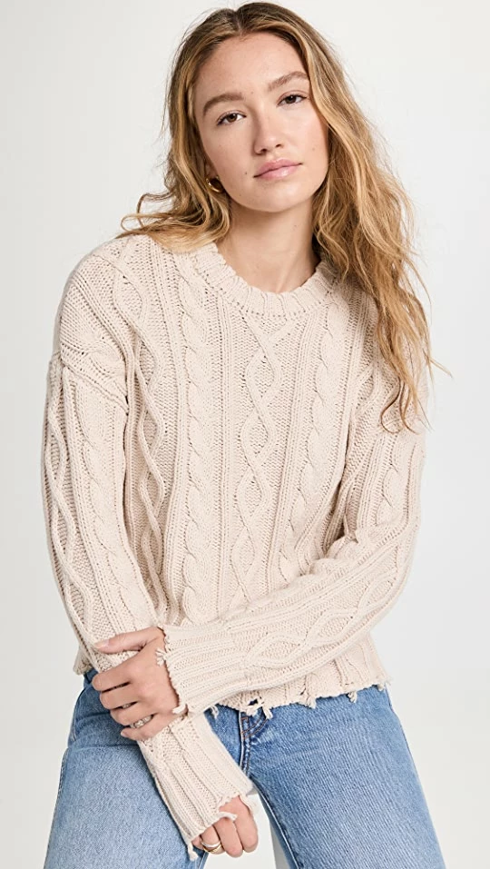 A charming essential with an edgy twist, this Pistola Denim sweater is detailed with traditional cable stitching and accented with distressing at the hem for a well-traveled look.