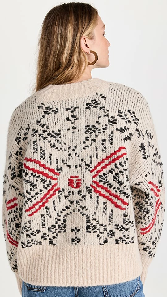 - Geometric intarsia pattern and embroidered accents
