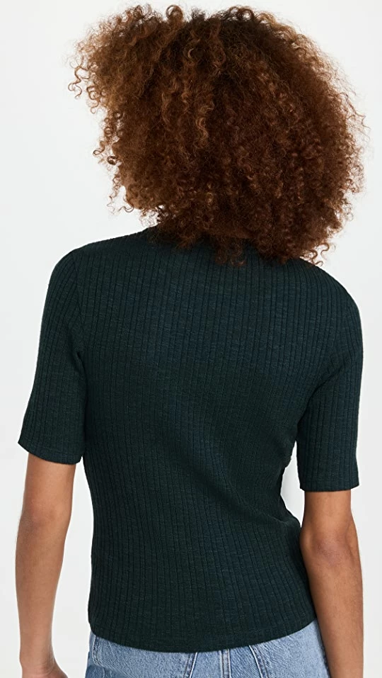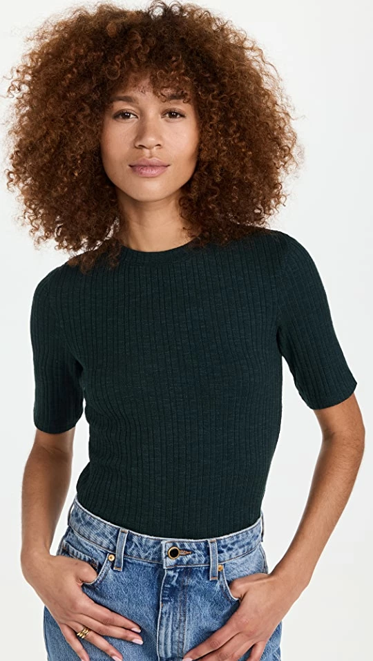 A simple Vince crew top with elbow-length sleeves, crafted from ribbed, dark-colored fabric. Crisp trousers and faded jeans will both suit this piece equally well.